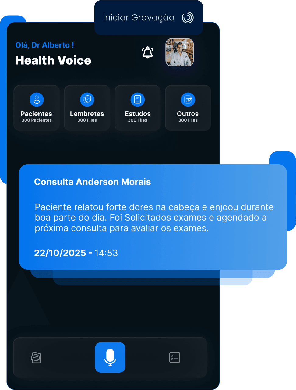 Eu passava horas documentando ao final do dia. Com a Health Voice, o relatório está pronto assim que a consulta termina. É incrível ter meu tempo de volta para a família, sem comprometer a qualidade da documentação. Recomendo a todos!