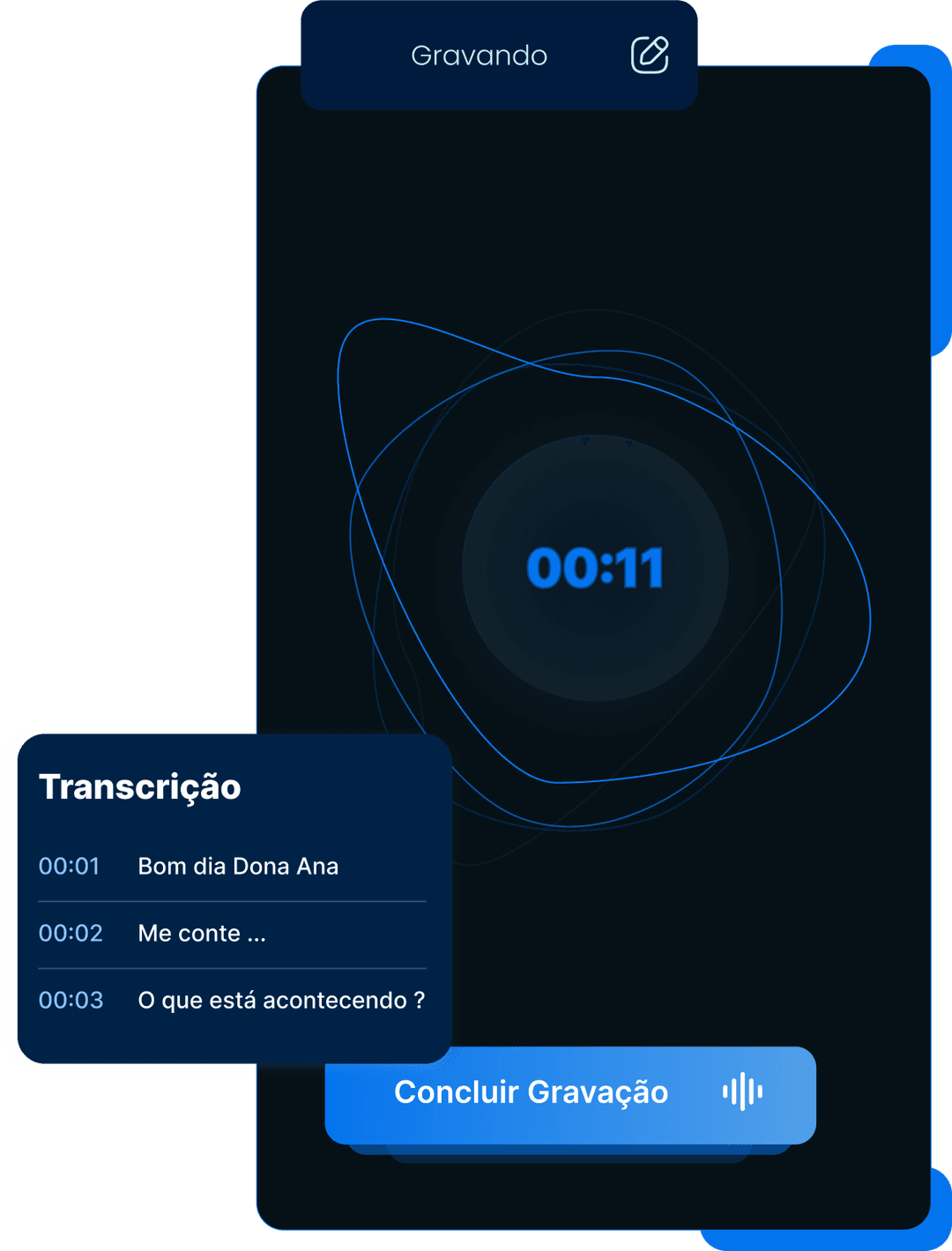 Transcrição 100% precisa no seu celular. Deixe a I.A. organizar cada detalhe da consulta.
